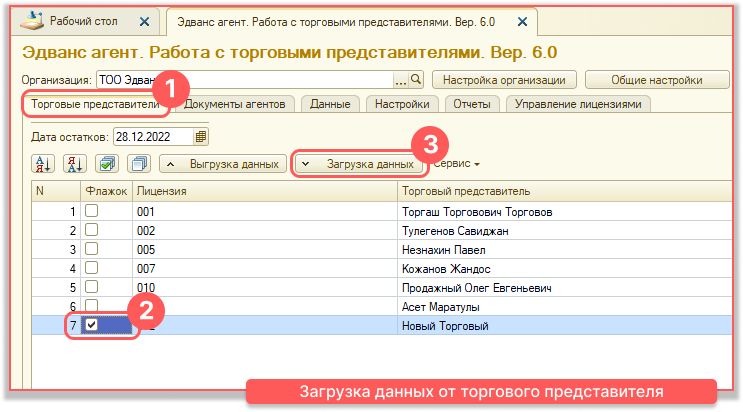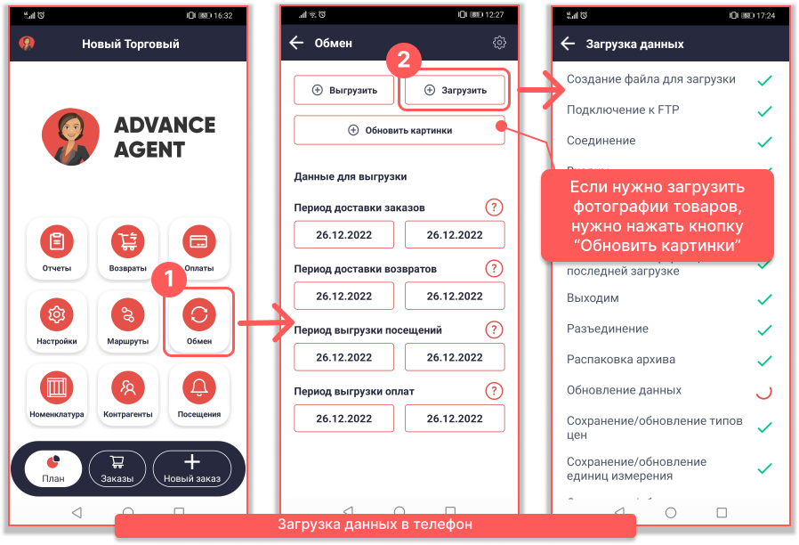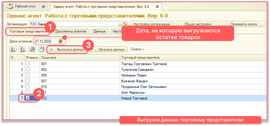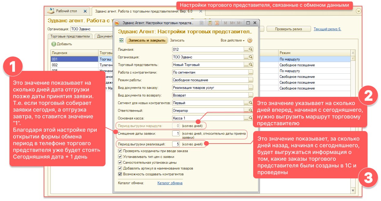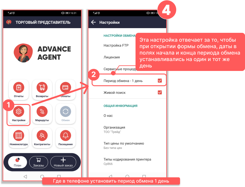 При открытии формы обмена в телефоне 01.01.2022, если настроен период обмена один день (на рисунке под №4) и смещение даты заявки равно 1 день (на рисунке под №1), то в полях “Период доставки заказов” будет стоять одна и та же дата - 02.01.2022. Если нажать кнопку “Выгрузить”, то выгрузятся только 2 заказа: для магазинов “Зима” и “Весна”, а заказ магазина “Лето” не будет выгружен, так как его дата отгрузки равна 03.01.2022. Чтобы выгрузился и этот заказ, нужно выбрать период обмена с 02.01.2022 по 03.01.2022 г., либо завтра - 02.01.2022 г. он попадет автоматически в выгрузку, так как период обмена на следующий день будет с 03.01.2022 по 03.01.2022 г.