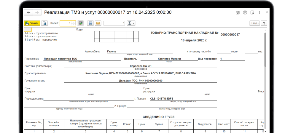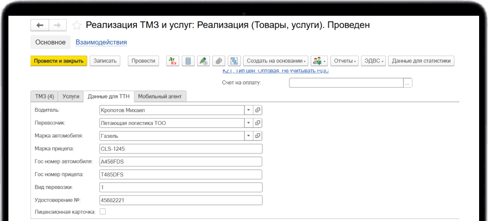 Позволяет указать данные по транспортировке у каждой реализации товаров и вывести их в печатную форму Товарно-транспортной накладной