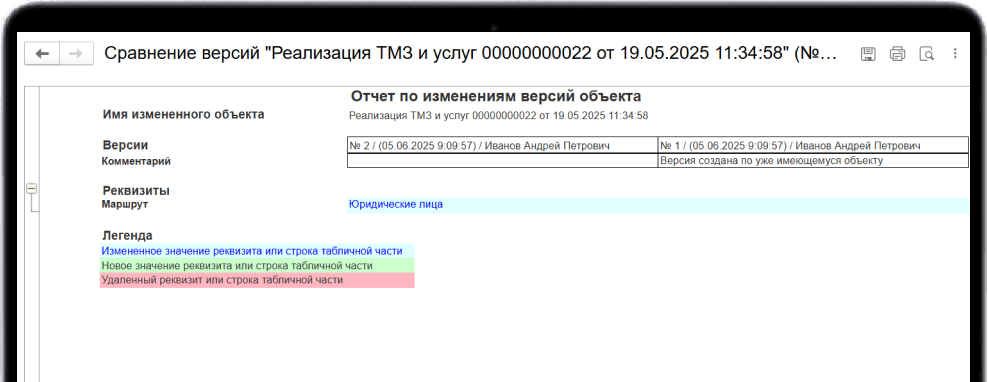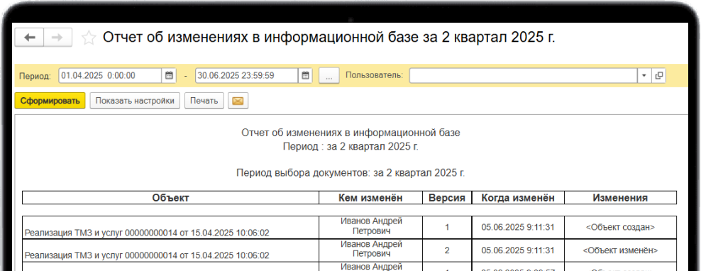 С помощью отчёта можно отследить историю изменений данных в документах и справочниках: указывается пользователь, дата и время изменений.