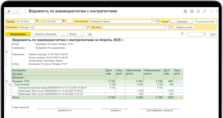 Отчёт Ведомость по взаиморасчётам с контрагентами