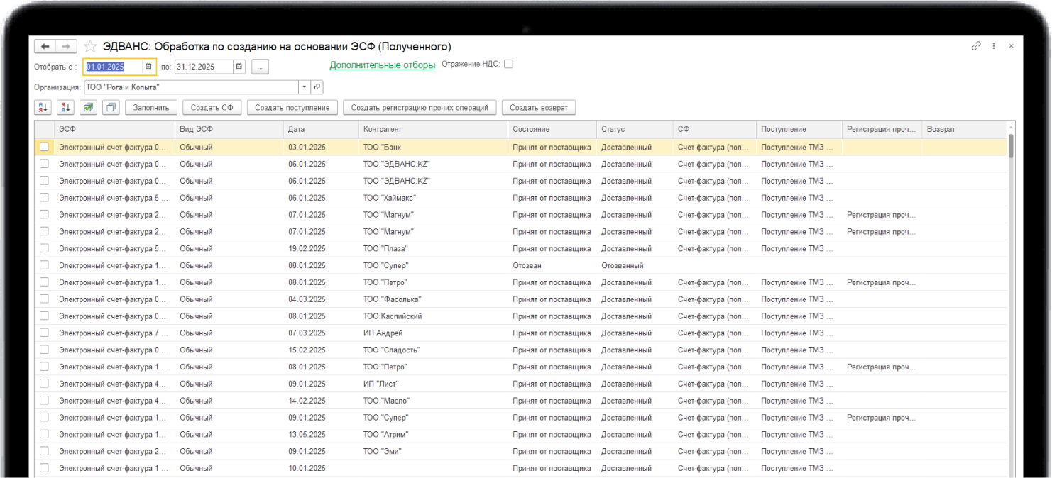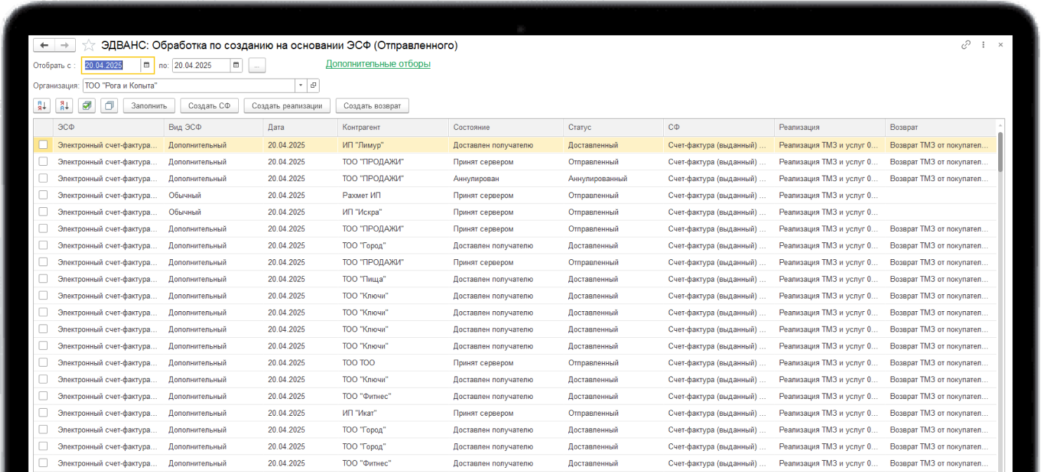 Данные обработки позволяют создавать документы на основании ЭСФ, которые загружены с сайта ЭСФ.