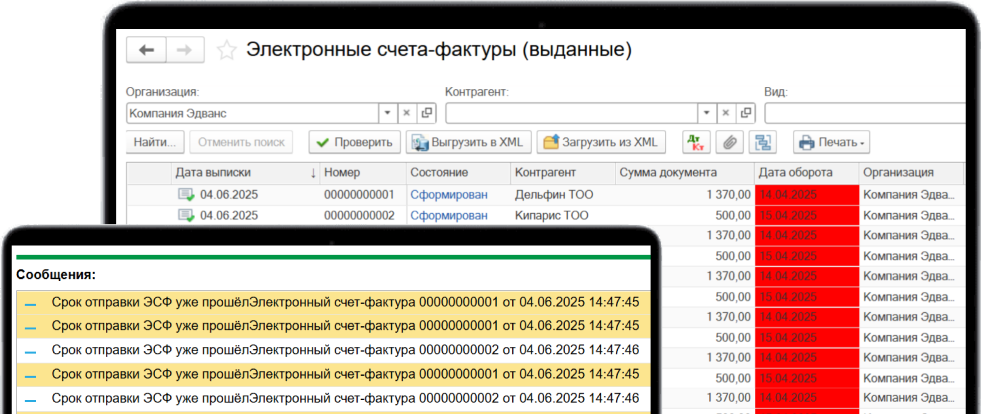 В списке отображаются счета-фактуры, у которых истекает срок отправки в ИС ЭСФ, а также при отправке проверяется не истёк ли срок у отправляемого документа