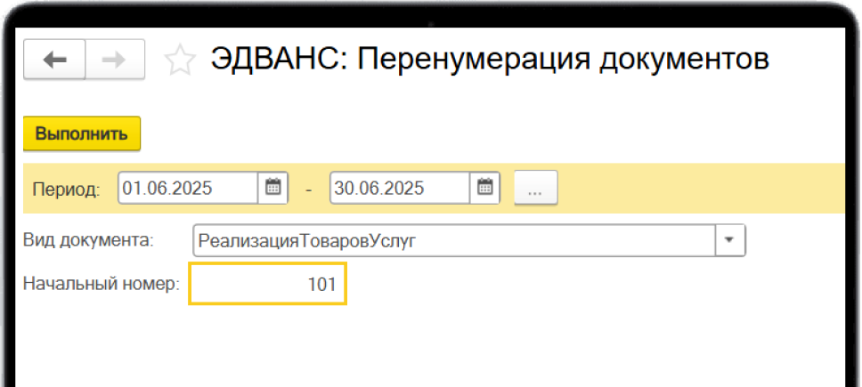 Функционал позволяет восстановить нумерацию документов за выбранный период с возможностью указать начальный номер