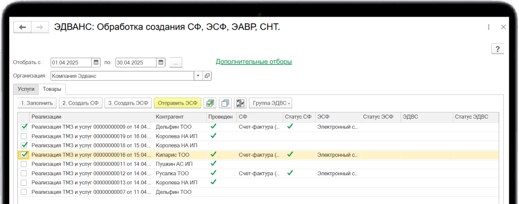 Это специальное рабочее место, в котором можно управлять созданием документов и отправкой их в ИС ЭСФ и Виртуальный склад. Не нужно перемещаться по документам — все на одном экране
